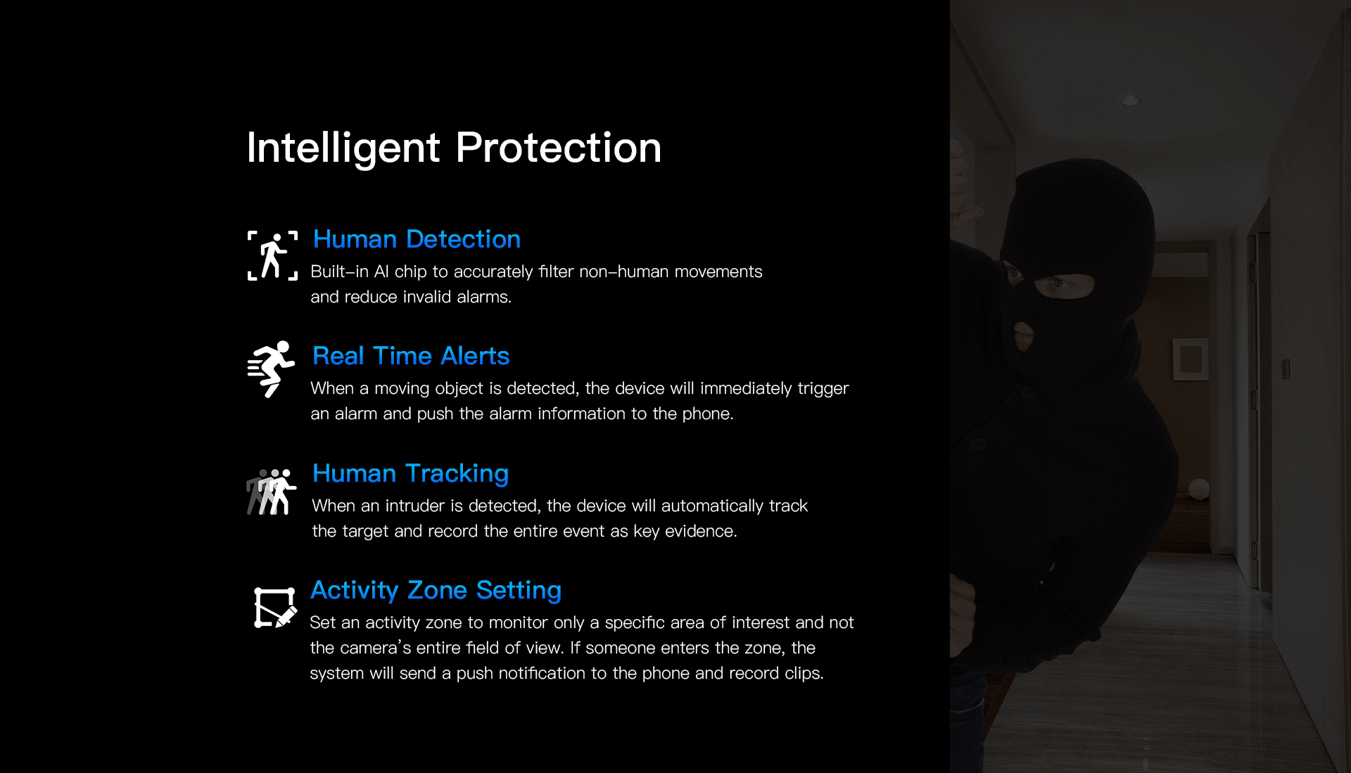 Built-in AI chip to accurately filter non-human movements and reduce invalid alarms.