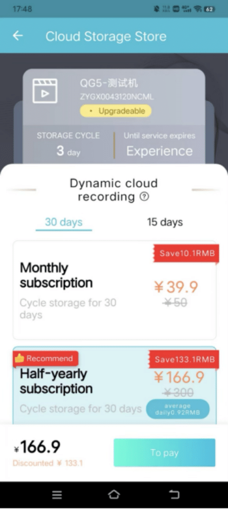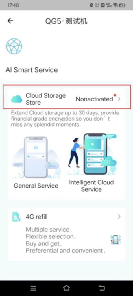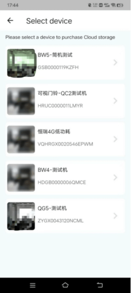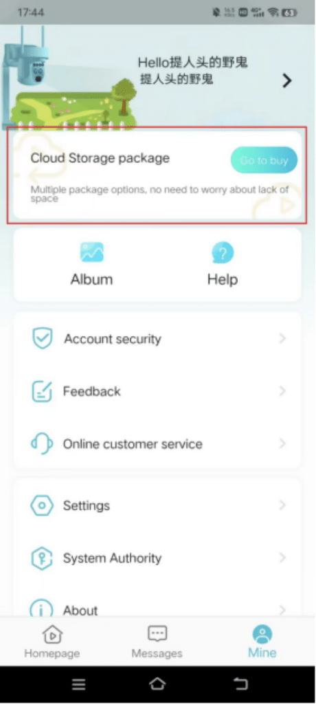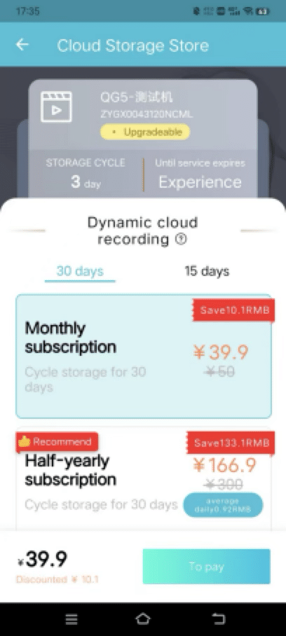 3. Open the App. On the homepage, click Mine > Cloud Storage package > Go to buy > Select device, and choose the desired package to buy.