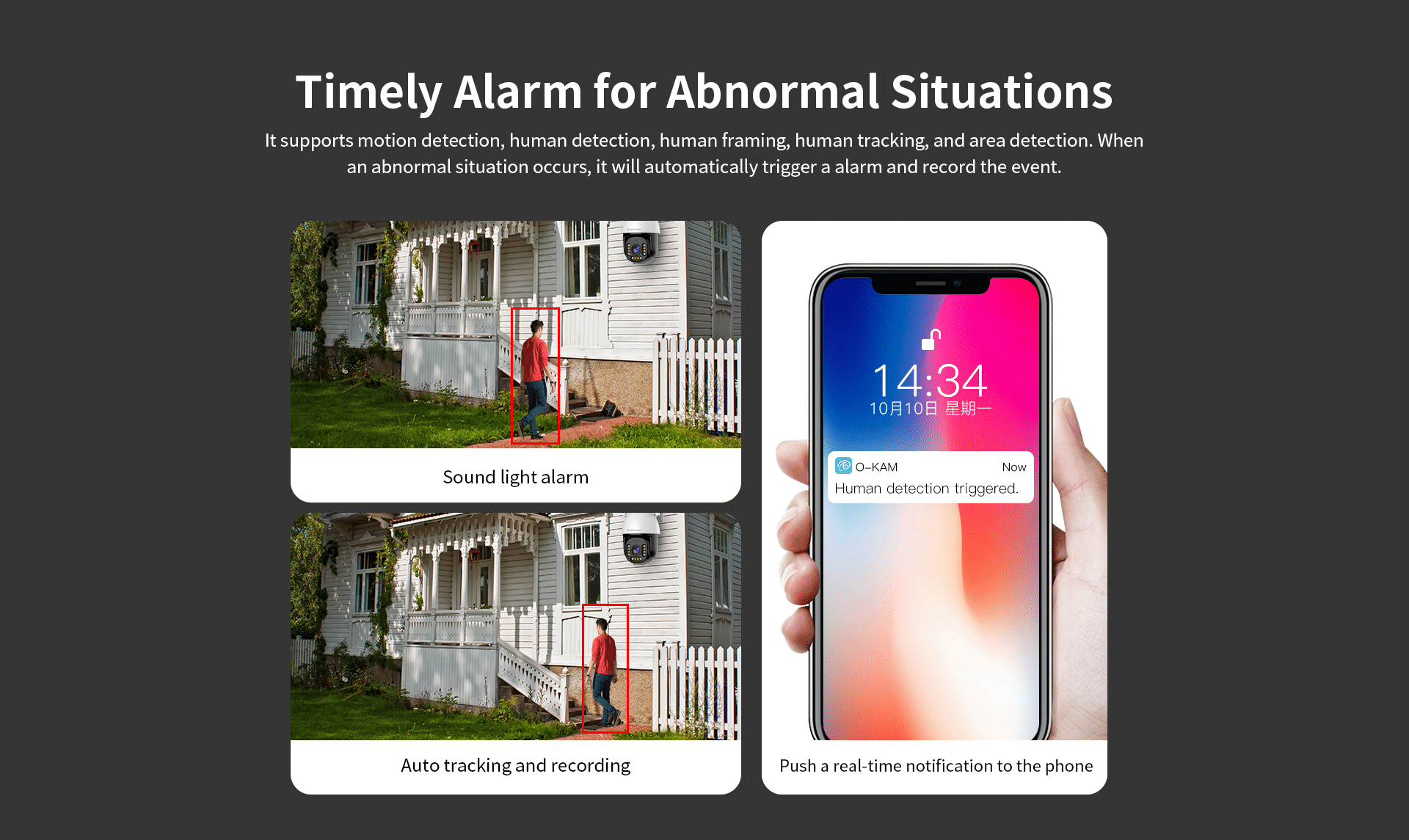 It supports motion detection, human detection, human framing, human tracking, and area detection. When an abnormal situation occurs, it will automatically trigger an alarm and record the event.