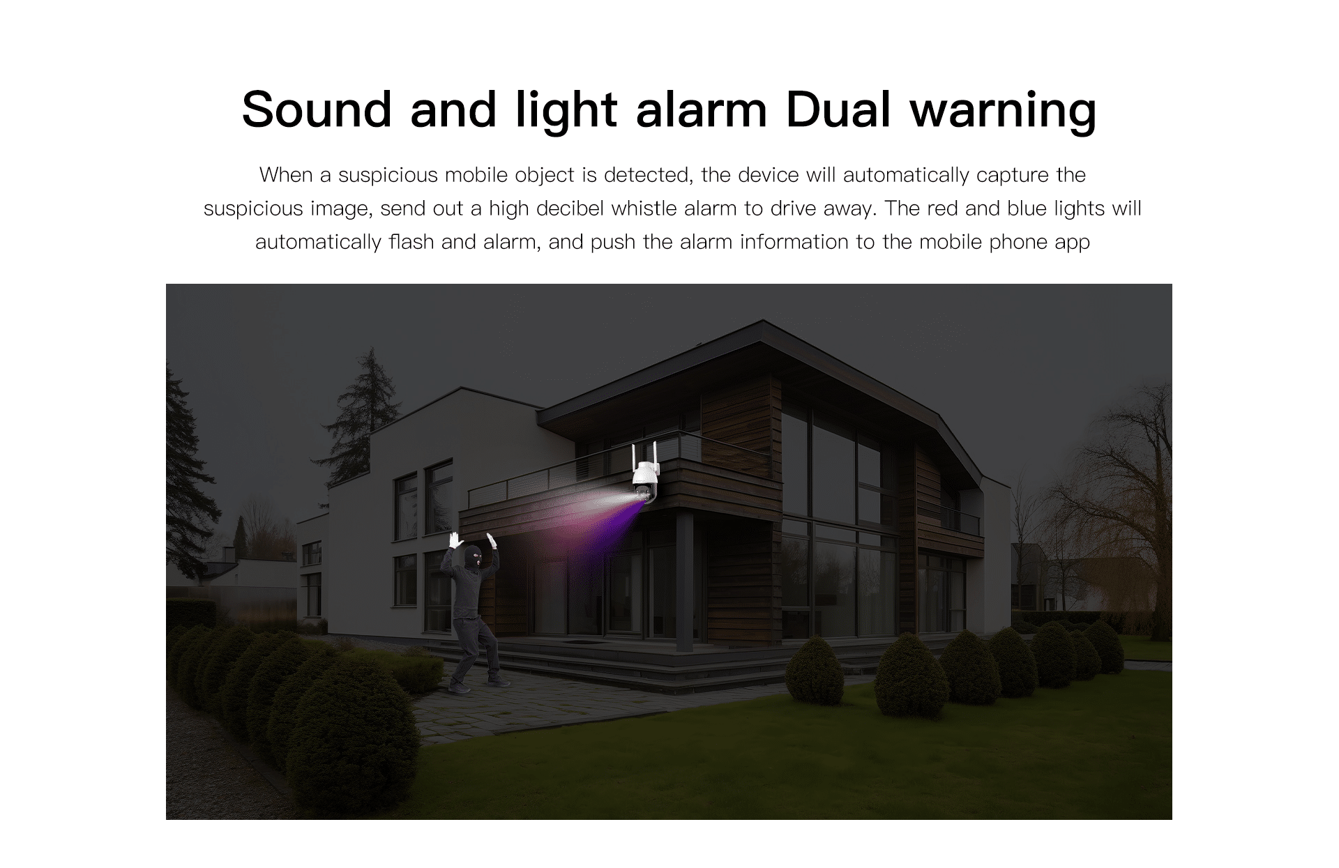When a suspicious mobile object is detected, the device will automatically capture the suspicious image and send out a high-decibel whistle alarm to drive away. The red and blue lights will automatically flash an alarm and push the alarm information to the mobile phone app.