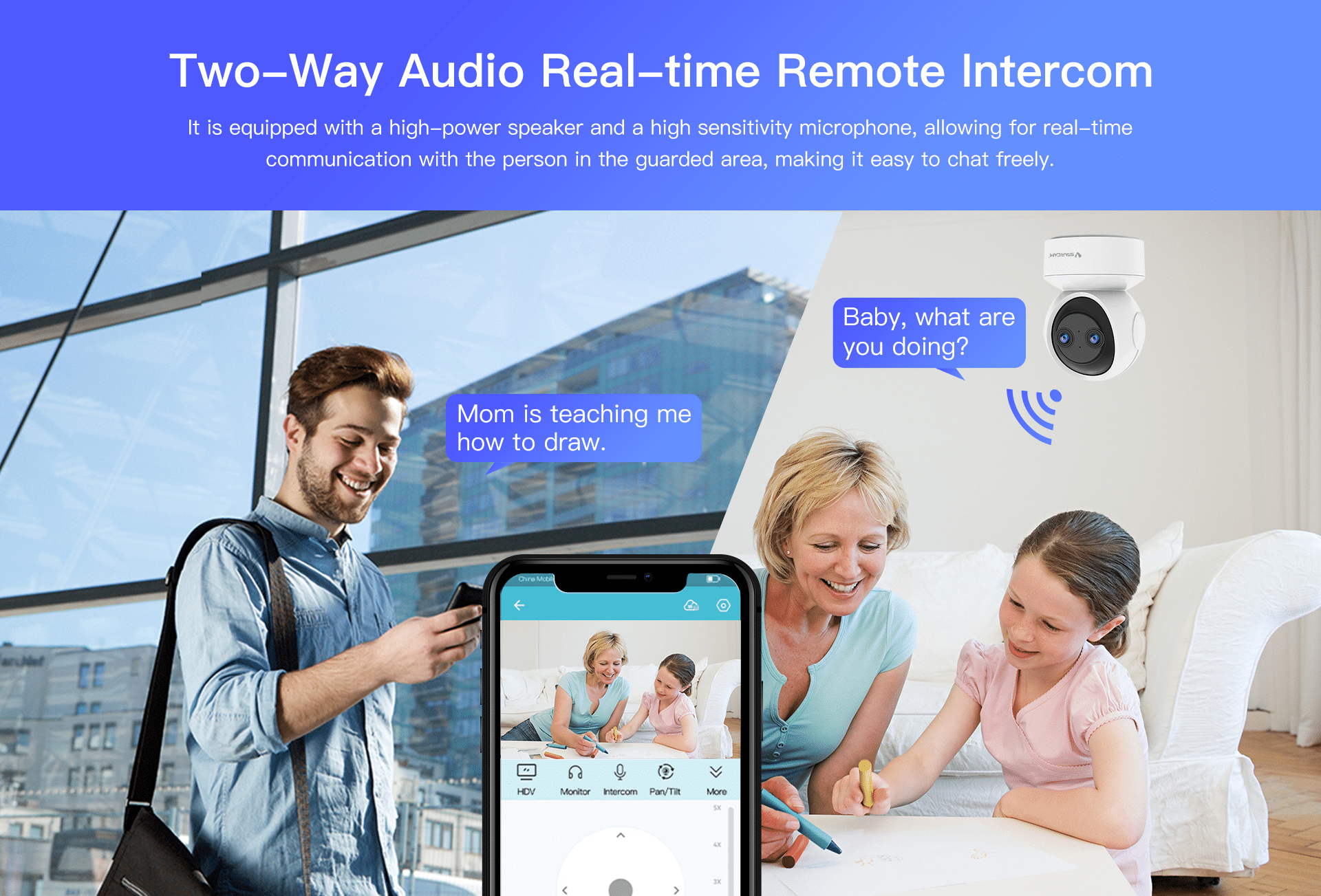 It is equipped with a high-power speaker and a high-sensitivity microphone, allowing for real-time communication with the person in the guarded area, making it easy to chat freely.