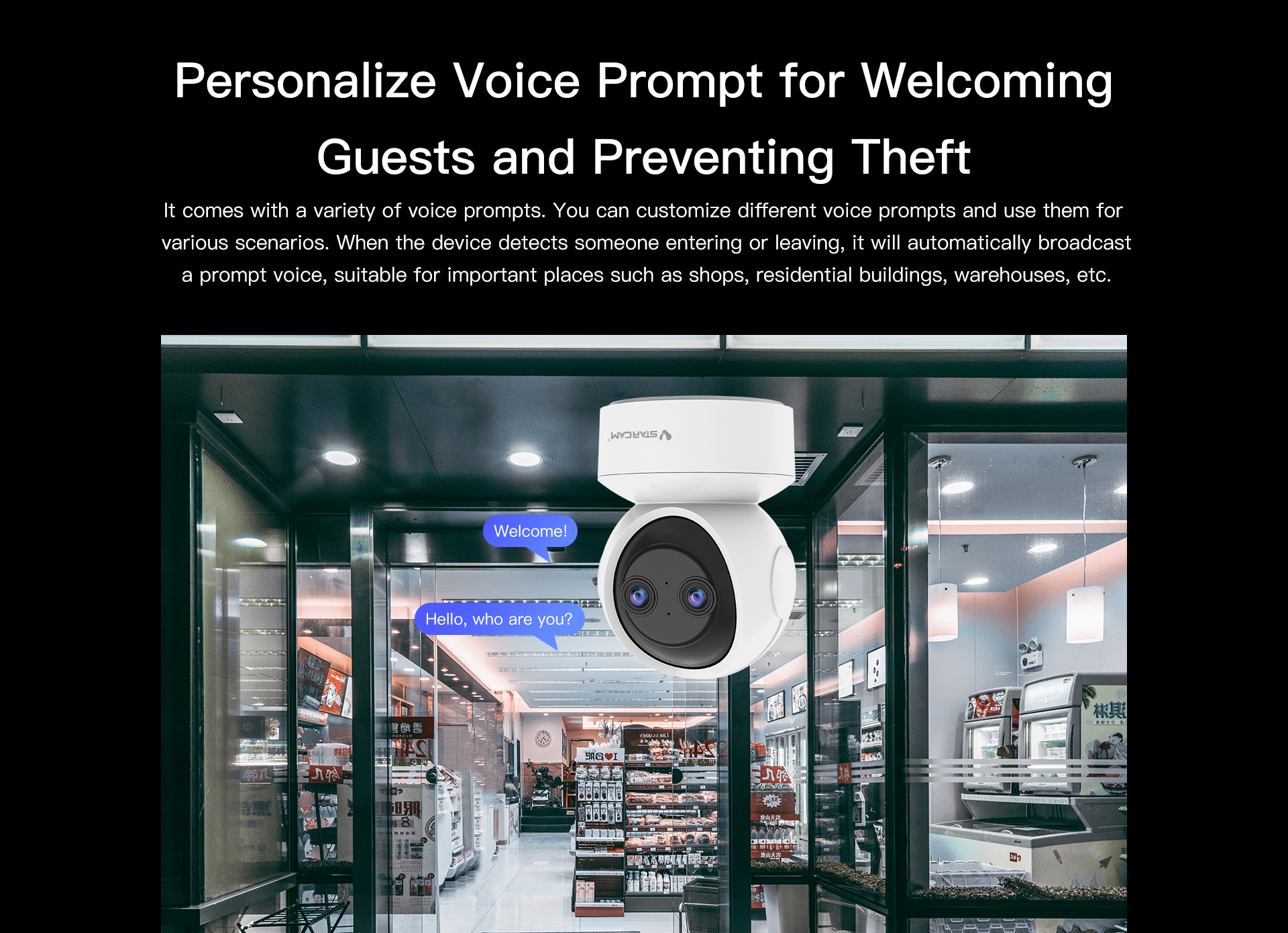 It comes with a variety of voice prompts. You can customize different voice prompts and use them for various scenarios. When the device detects someone entering or leaving, it will automatically broadcast a prompt voice, which is suitable for important places such as shops, residential buildings, warehouses, etc.