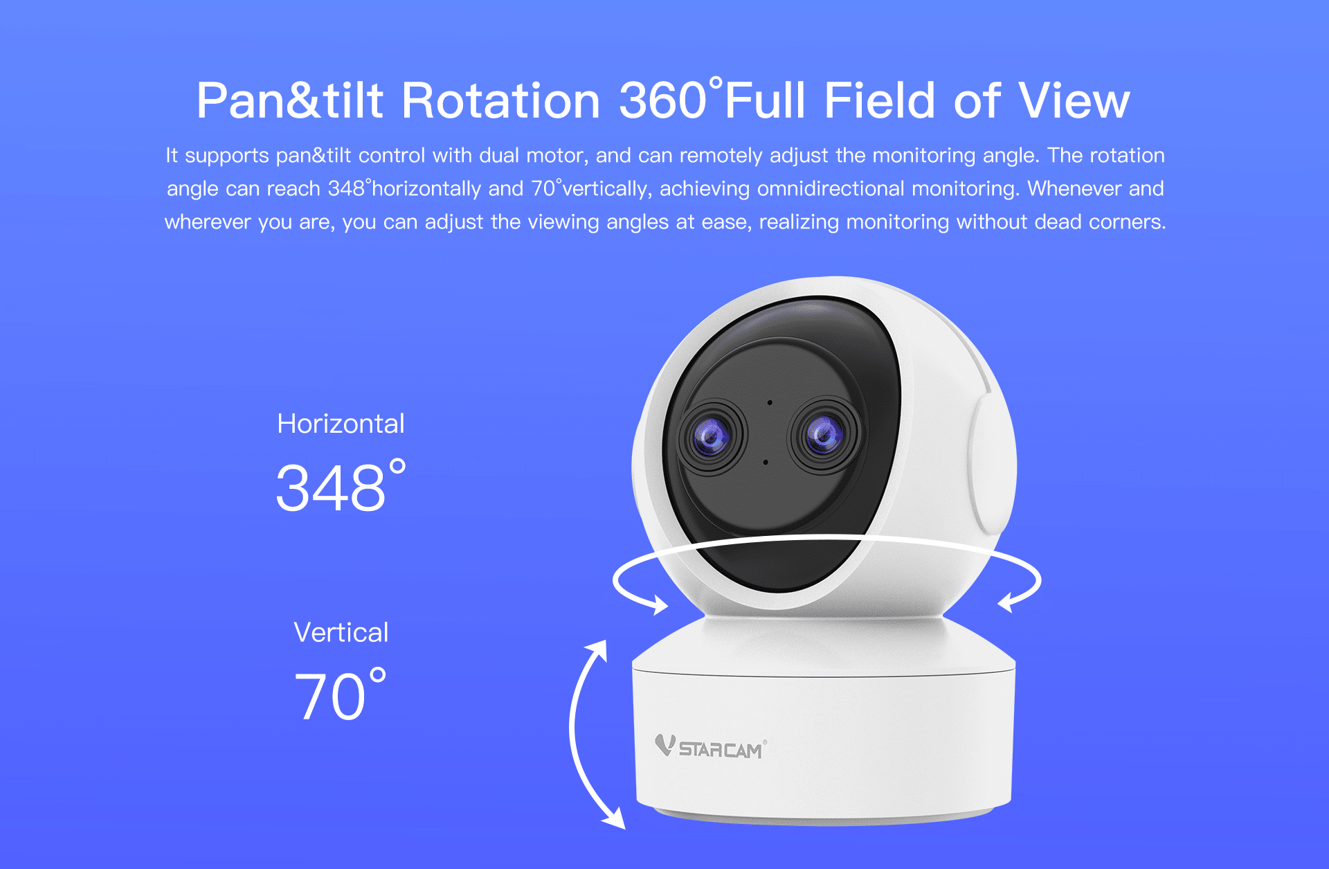 It supports pan and tilt control with a dual motor and can remotely adjust the monitoring angle. The rotation angle can reach 348’horizontally and 70″ vertically, achieving omnidirectional monitoring. Whenever and wherever you are, you can adjust the viewing angles at ease, realizing monitoring without dead corners.