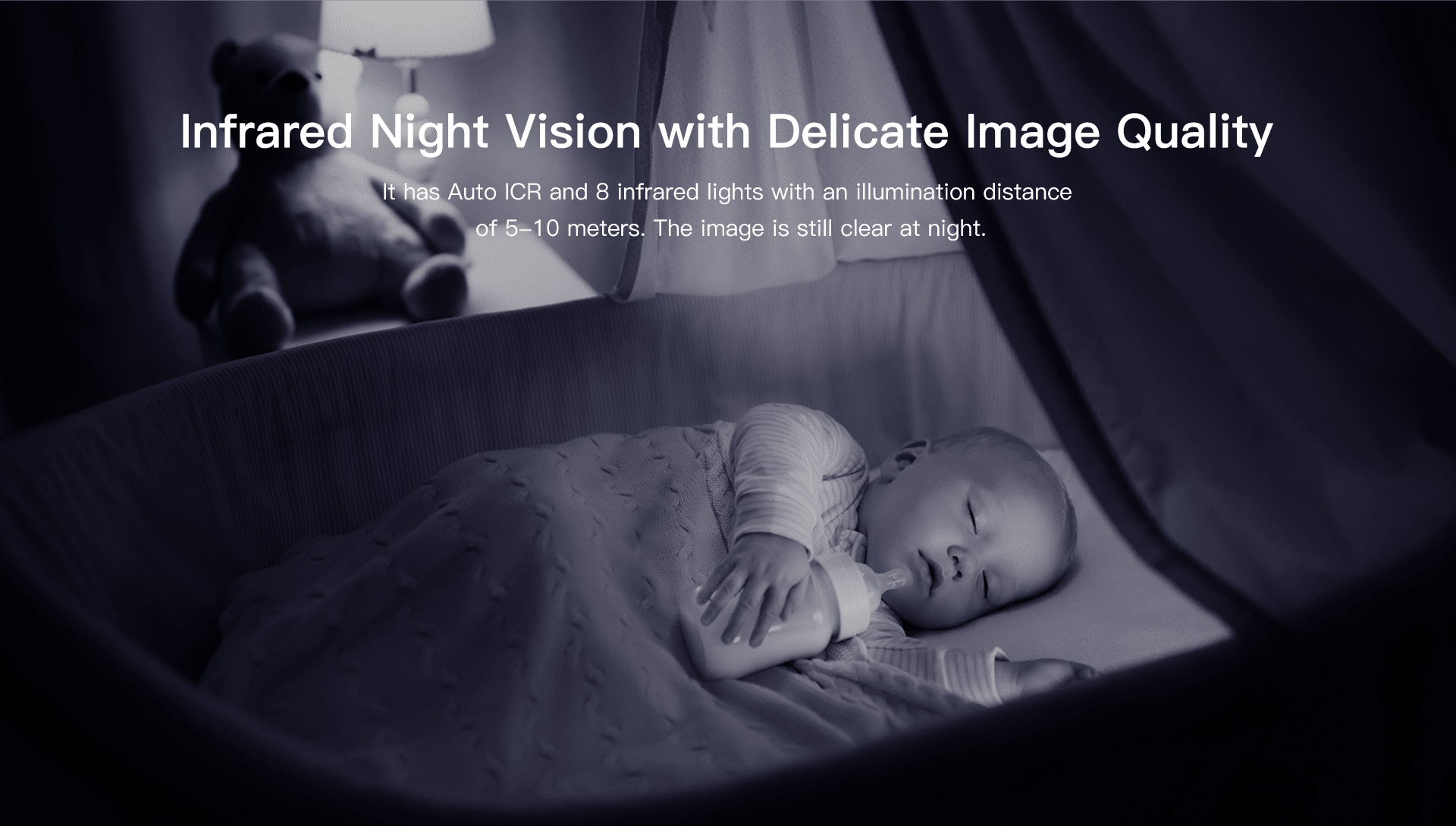 It has Auto lCR and eight infrared lights with an illumination distance of 5-10 meters. The image is still clear at night.