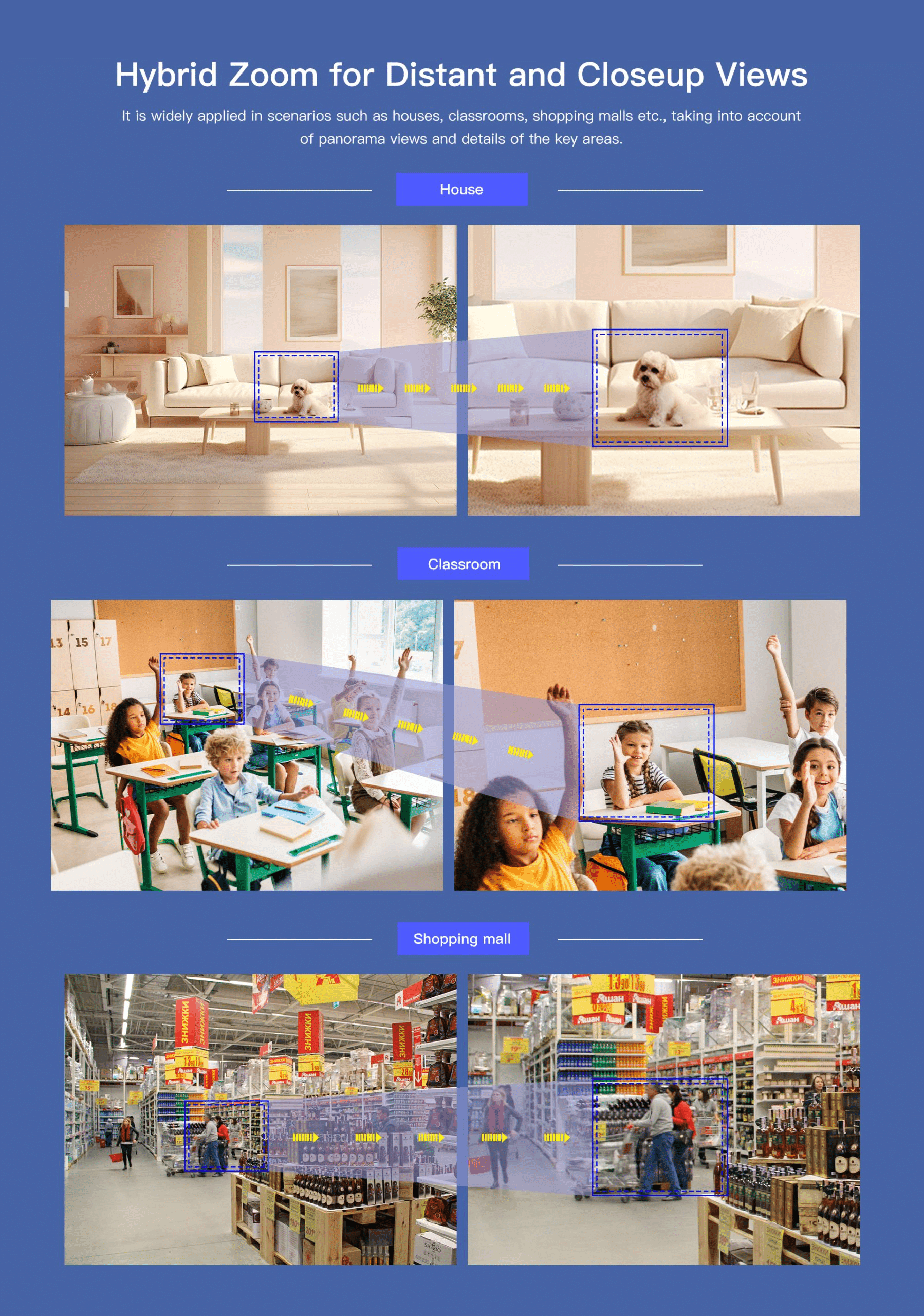It is widely applied in scenarios such as houses, classrooms, shopping malls, etc., taking into account of panorama views and details of the key areas.
