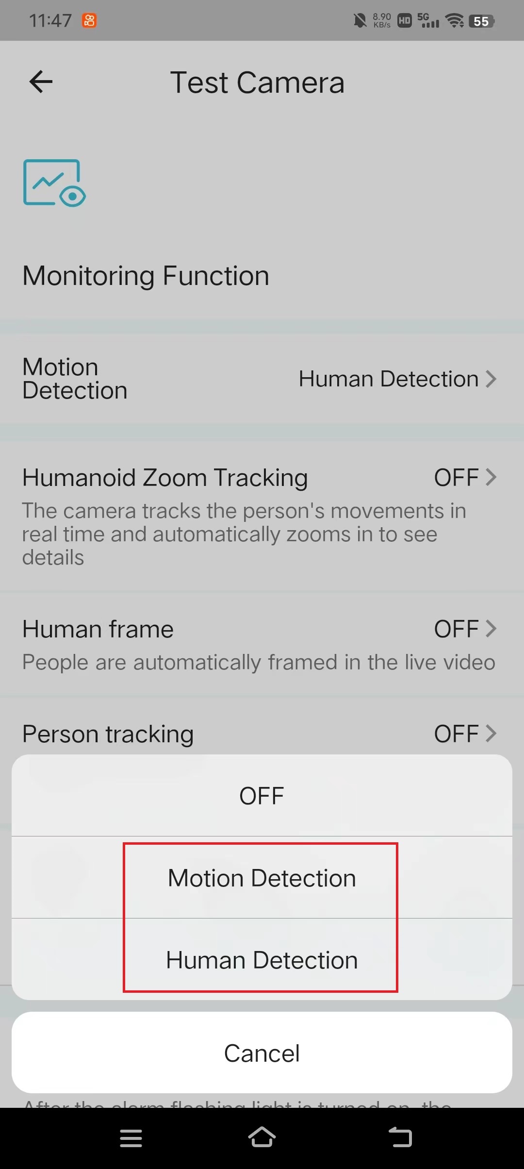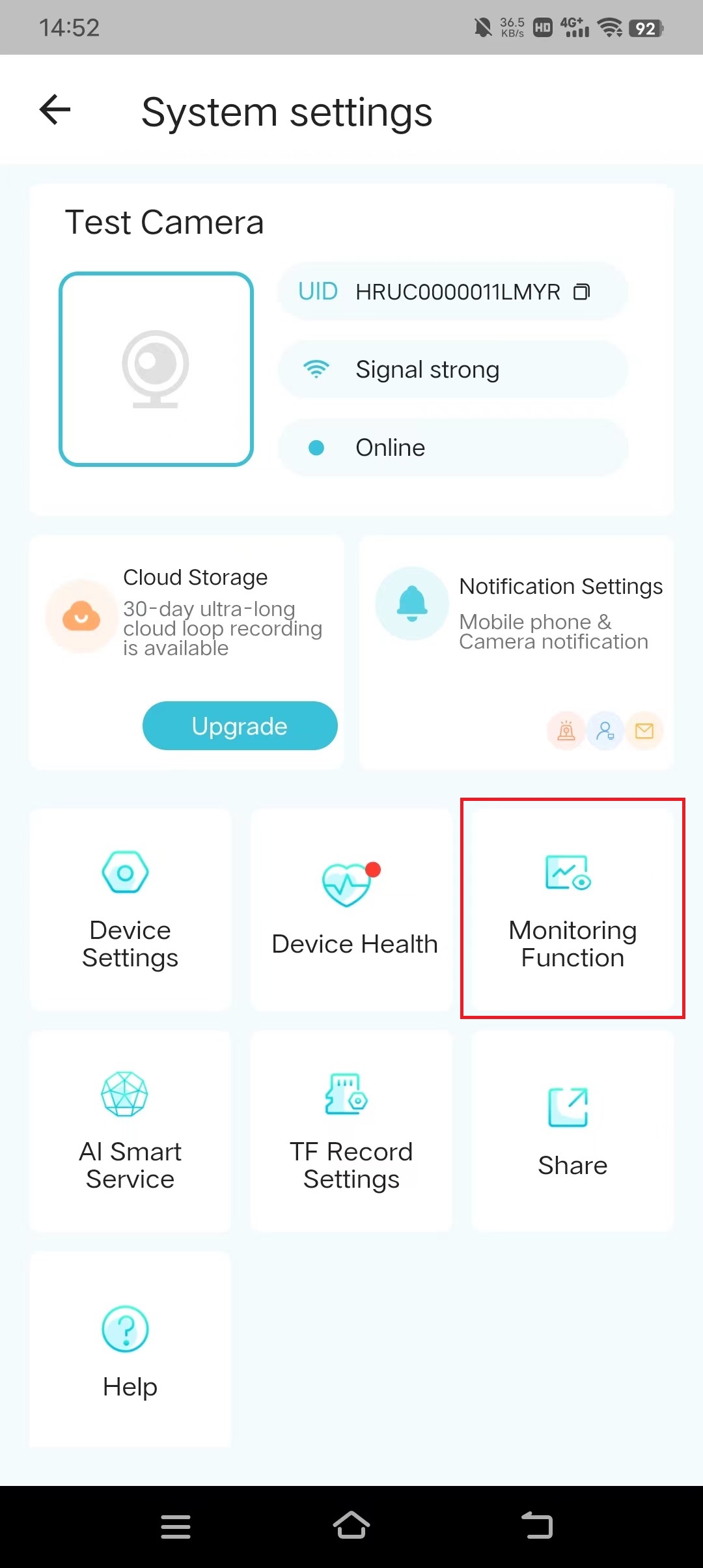 1. Check if motion detection alarm settings on the App are enabled; On the homepage, click Settings > Monitoring Function > Motion Detection, to enable it or choose Motion Detection or Human Detection.