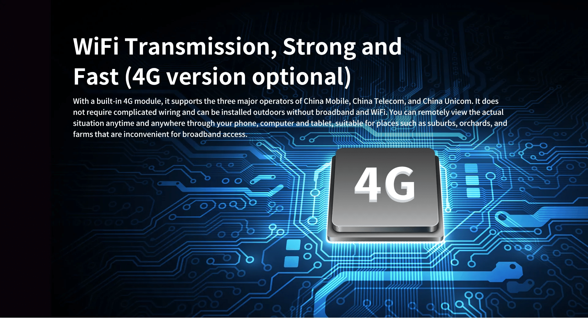 With a built-in 4G module, it supports the three major operators of China Mobile, China Telecom, and China Unicom. lt does not require complicated wiring and can be installed outdoors without broadband and wifi; You can remotely view the actual situation anytime and anywhere through your phone, computer, and tablet, suitable for places such as suburbs, orchards, and farms that are inconvenient for broadband access.