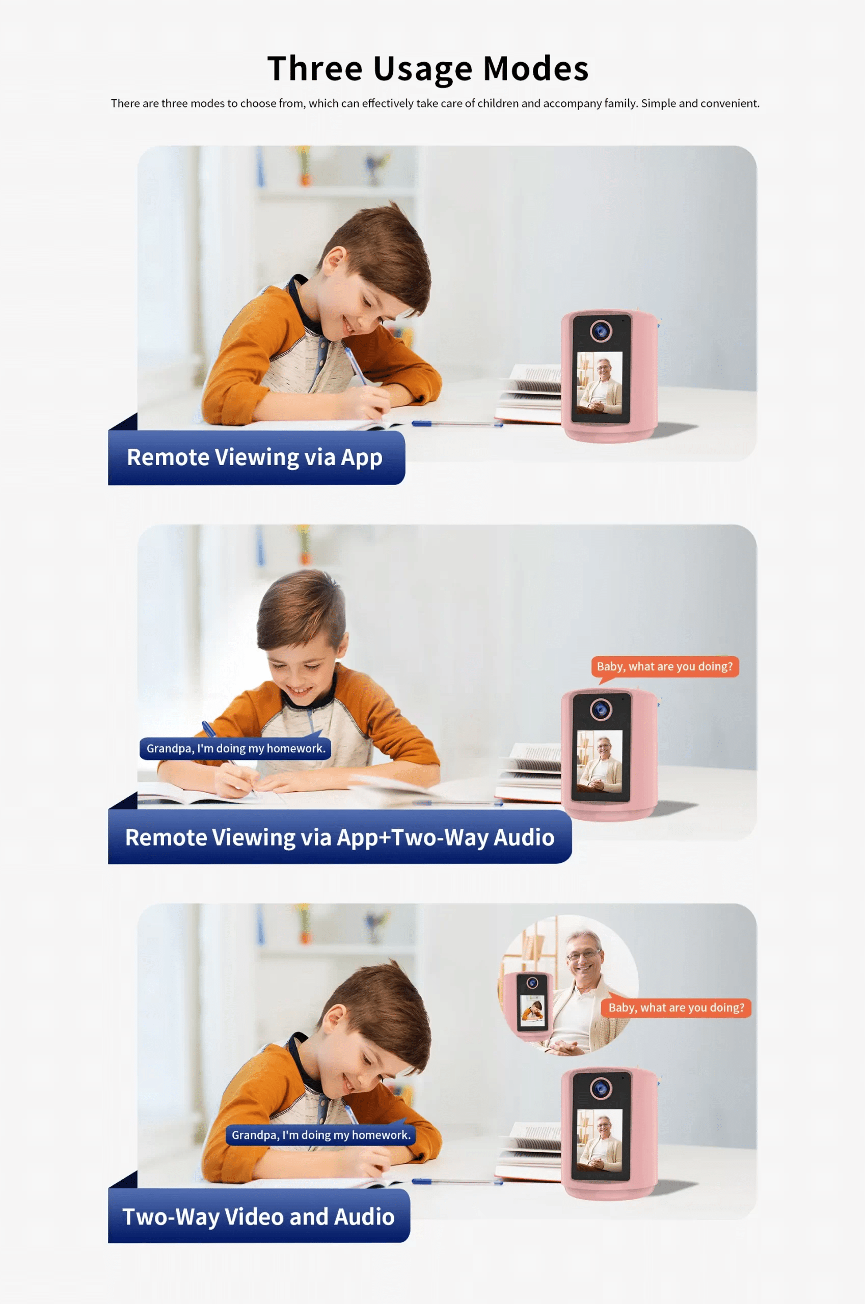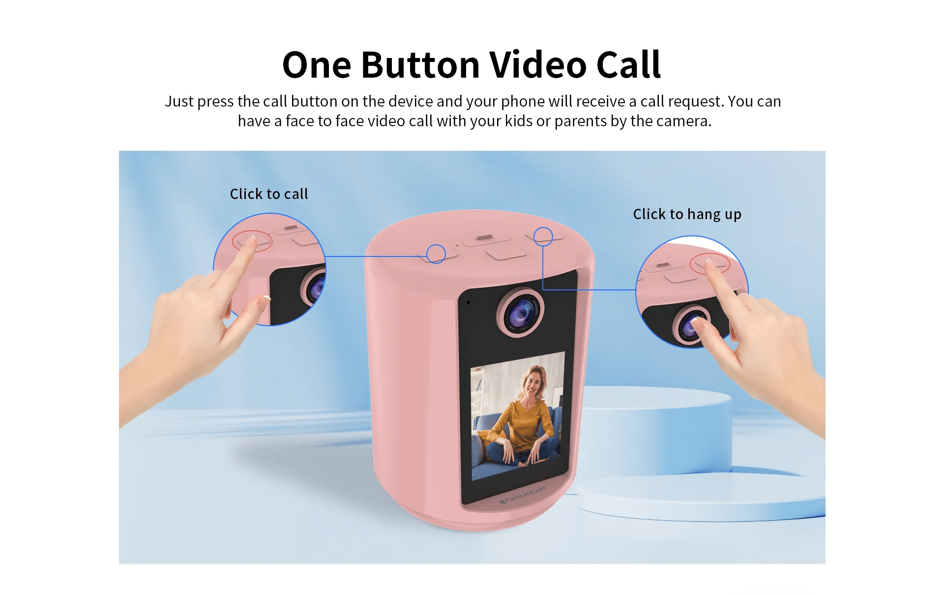 Just press the call button on the device, and your phone will receive a call request. You can have a face-to-face video call with your kids or parents by the camera.
