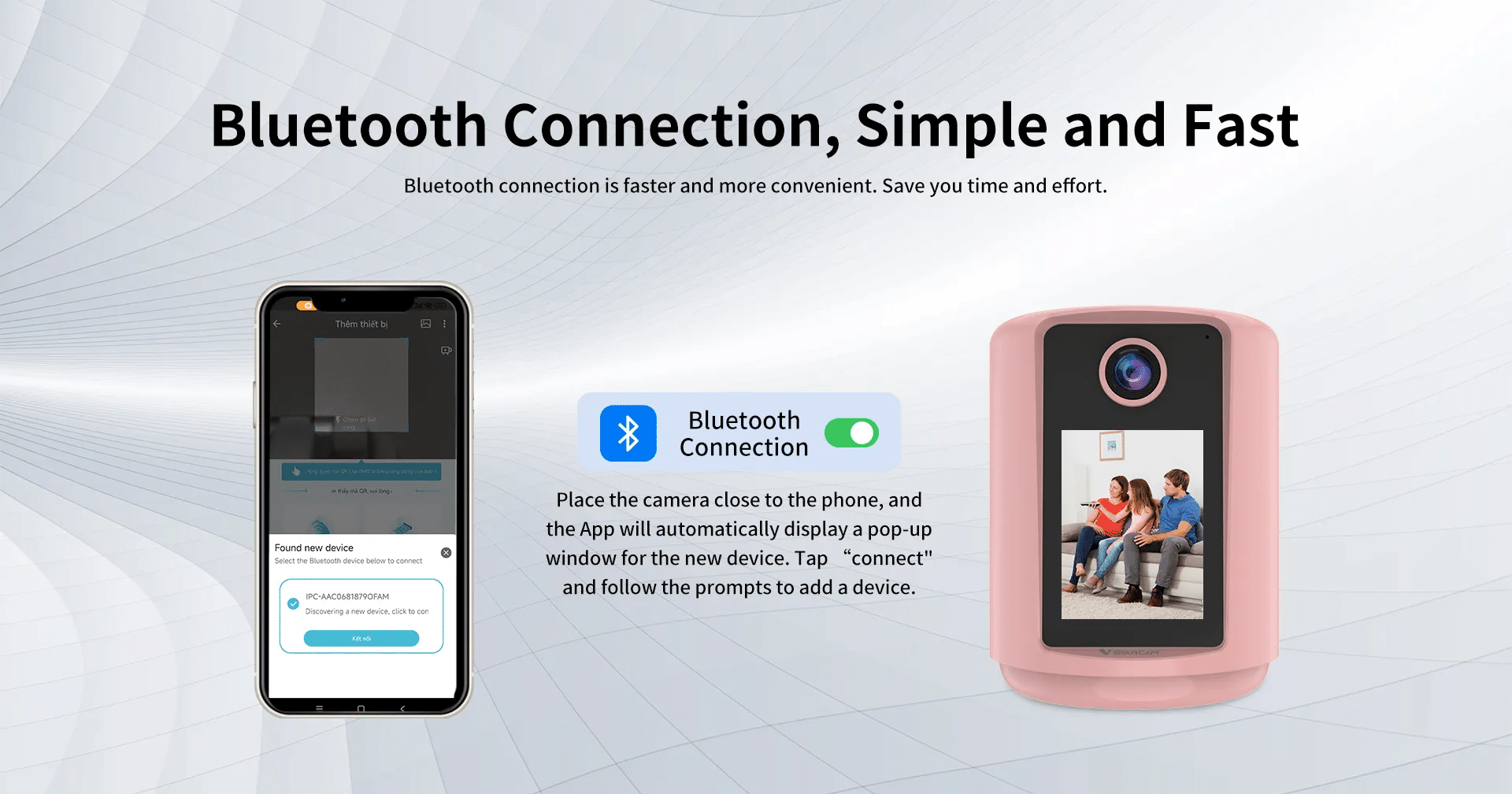Place the camera close to the phone, and the App will automatically display a pop-up window for the new device. Tap “connect and follow the prompts to add a device.